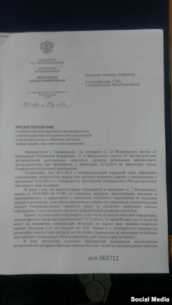 «Прокуратура» и полиция Симферополя вынесли предостережение Комитету по защите прав крымскотатарского народа о недопустимости проведения митинга в Международный день по правам человека 10 декабря.