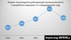 «Министерство» промышленной политики Крыма в своем «Макроэкономическом обозрении» за 2014 год бравирует ростом добывающей промышленности и разработки карьеров на 8,6%. Это, действительно, единственная сфера, в которой наблюдается прирост показателей, но проблема в том, что этот прирост в 2014 году... замедлился.