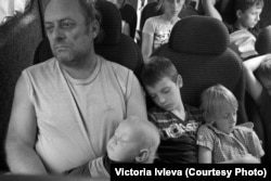 – Это фотография первой семьи, которую я вывезла из Славянска, семьи Кравчуков. Они сидят в маленьком микроавтобусе, там семеро детей, и они все между собой ужасно похожи. Там с совершенно фантастическим взглядом сидит папа, больше боли и отрешенности, чем у него во взгляде, трудно найти. Боль и отрешенность, я думаю, что это то, что там все время витает в воздухе, и еще – полное отсутствие простой житейской красоты и тайны.