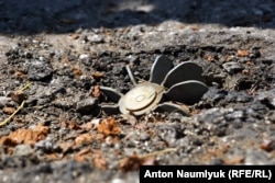 На дороге "Хохол" показывает нам утопленные в асфальт хвостовики мин. "А здесь разорвалась новая разработанная мина, – показывает боец. – Она взрывается над землей и под давлением уходит вниз". На дороге на расстоянии нескольких метров вокруг раскиданы ямы, как будто асфальт был мягкий и в него кинули много крупных и мелких камней.