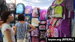 Родители, которым «посчастливилось» снаряжать детей в школу в российском Крыму, ходят от одного киоска к другому – прицениваются. Женщина с длинным списком необходимого записывает цены на каждую позицию. Кроме канцтоваров, формы и ранца в перечне – банты, гольфы, колготки.