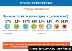 Плачевность ситуации вызвана еще и тем, что вот уже два года как Северо-Крымский канал – главный источник орошения с/х территорий – простаивает без воды. Таким образом, 1,5 млн крымчан лишены возможности, как раньше, заниматься сельским хозяйством, в том числе и подсобным. А это потери не только рабочих мест, но и миллиардные убытки для всего полуострова. Все эти факторы привели к нарушению балансов по продовольственной безопасности Крыма.