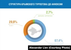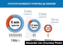 А ведь именно украинцы до аннексии всегда составляли основную часть туристического потока – 67,4%. Это несменная тенденция еще с советских времен. Например, в 1986 г., когда Крым посетило наибольшее количество туристов – 8 млн человек, 5 млн из них составили именно украинцы. И наоборот, во времена самого никудышного турсезона 1993-го, когда на полуостров прибыло всего 2,3 млн туристов, два миллиона из них тоже были украинцы.
