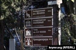 Вот главное и, по сути, единственное украшение, которым Россия одарила за полтора года Крым. Эти указатели понатыканы везде, где нужно и где не нужно. Причем абсолютно одного размера, цвета и дизайна – и на обочинах скоростных магистралей, и в глухих переулках южнобережных поселков, от Севастополя и до Керченской переправы. Понятно, что государственных в Крыму украинского и крымскотатарского языков на этих табличках ожидать не приходится, они явно изготавливаются под одну гребенку на всю Россию-матушку. Но зато есть дубляж на английский, хоть и значительно более мелким шрифтом. Одна проблема – некому читать на вражеском языке. Нет в Крыму иностранцев. Но, может, это и к лучшему, позора меньше - сдается мне, что у авторов этого шедевра российского дизайна с английским в школе были явные проблемы. Как и с биологией – в пиктограмме крокодиляриума я так и не смог обнаружить даже намека на черты лучшего друга Чебурашки.