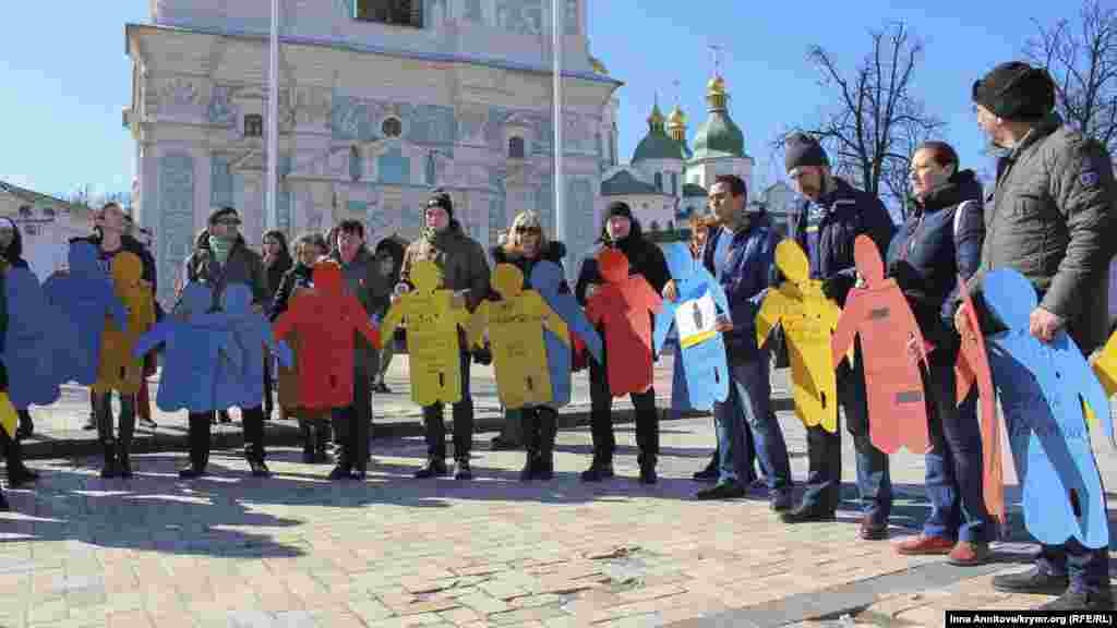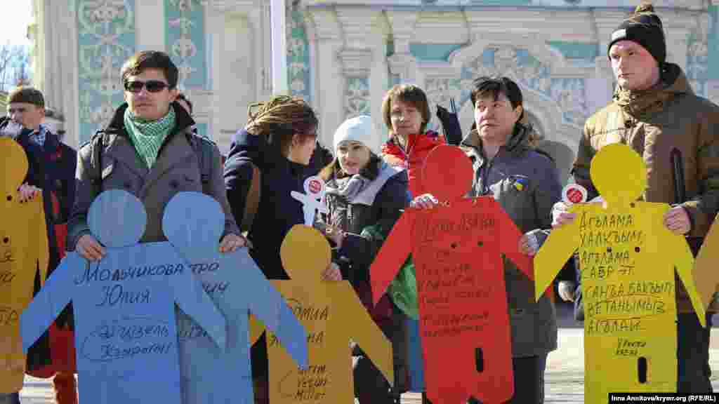 16 марта общественные деятели, крымчане, активисты, журналисты, правозащитники собрались на Софийской площади Киева, чтобы почтить память Решата Аметова, который стал первой жертвой российской аннексии Крыма. Участники акции держали в руках разноцветных картонных человечков, на которых были написаны имена всех тех, кто не смог присоединиться к ним сегодня, но поддержал акцию и почтил память крымскотатарского активиста. Два года назад Решат Аметов вышел в центр Симферополя с одиночным пикетом и выступил против действий российской власти в Крыму. Его похитили 3 марта 2014 года. 15 марта тело Аметова со следами пыток было найдено в лесу Белогорского района Крыма.