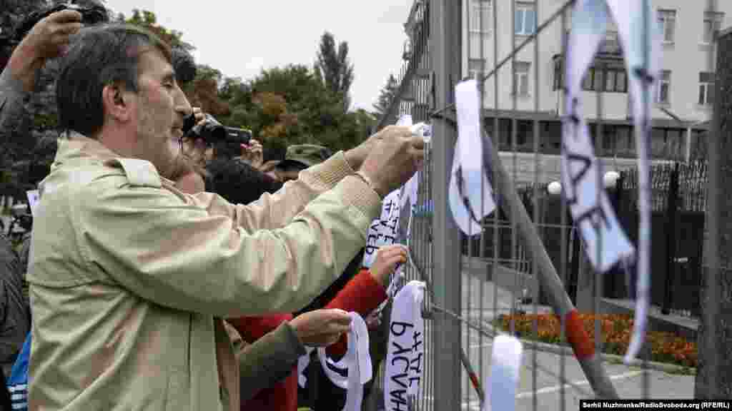 Пикетчики привязывают к забору посольства России белые ленты с именами похищенных
