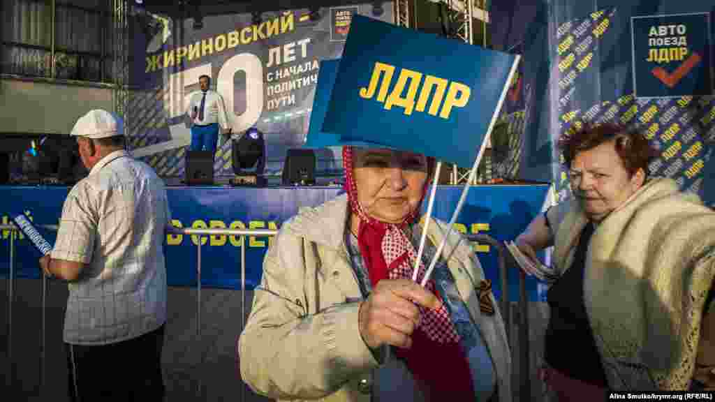 На площади Ленина 3 мая в Симферополе российская партия ЛДПР организовала агитационный концерт, в котором приняли участие исполнители Алексей Гоман и Катя Лель. Как сообщает корреспондент Крым.Реалии, у сцены принимали обращения граждан к партии и ее главе Владимиру Жириновскому. Крымчанам также привезли макет политика, с которым мог сфотографироваться каждый желающий.