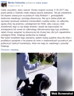 Во вторник российские, украинские и пророссийские издания распространили новость: будто бы в Польше избили украинскую школьницу. Это вроде бы произошло возле одной из школ польского Гданьска. Так, например сайт украинского канала ZIK вышел с заголовком: «В польской школе толпа подростков жестоко избила украинку». СМИ сослались на Facebook-страницу Марики Питлевской, которая выложила видео избиения в открытый доступ.