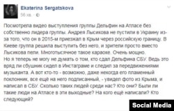 Кроме восторга от выступления без солиста и поддержки решения СБУ, были и те, кто возмутился запрету въезда певцу. Журналистка Екатерина Сергацкова, которая сейчас работает в «Украинской правде», на своей странице в фейсбуке задала риторический вопрос: кто «сдал» Андрея Лысикова в СБУ, чтобы ему запретили въезд в Украину.