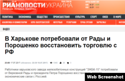Российская ведущая рассказывает: «Жители Харькова требуют от власти немедленно восстановить экономические связи с Россией. Митинг, на который вышли 500 человек, прошел в понедельник на территории местного завода железобетонных конструкций. Рабочие скандировали: «Дайте нам работу!». Предприятие находится на грани разорения. С подобными требованиями к президенту Порошенко обратились уже более десятка крупных производств страны».