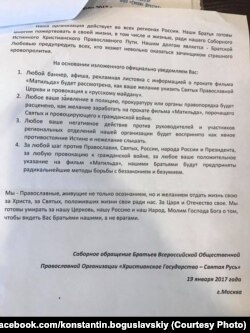 – Писем было два. Письмо, которое я опубликовал [в фейсбуке], было в январе 2017 года, потому что прокат фильма первоначально был назначен на весну. Потом, когда прокат перенесли на более поздний срок, нам пришло второе письмо, это было в июле или в августе, и оно было примерно похожего содержания, только более широкое, на пять листов оно было. В целом суть там такая же.