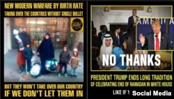 "Современная война ведется с помощью деторождения, – гласит надпись на левой картинке. – Но они не захватят нашу страну, если мы не позволим им въехать". Текст на правой: "Президент Трамп положил конец давней традиции праздновать Рамадан в Белом доме".