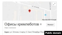 "Фабрика троллей", когда-то работавшая в Ольгино, а затем на улице Савушкина, теперь существует по новому адресу в Петербурге: улица Оптиков, д. 4, корпус 3. Забавно, что гугл-карты выдают при поиске этого адреса "офисы кремлеботов".