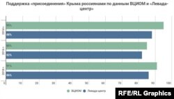 Опрос прокремлевского ресурса ВЦИОМ и независимого «Левада-центр» дали схожие результаты – от 86% до 91% россиян поддерживают «присоединение Крыма». И если первый опрос можно считать заказным, то в отношении «иностранного агента», каким в России признали «Левада-центр», такой подход вряд ли уместен.
