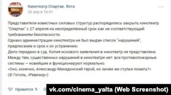 Прокуратура Ялты 27 апреля отрапортовала о закрытии трех объектов: кинотеатра «Спартак» и торговых центров «Конфетти» и «Дом торговли». В сообщении ведомства утверждается, что в этих учреждениях нарушаются правила пожарной безопасности.