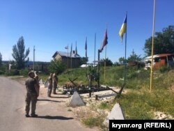 Чистим от травы памятник погибшим недалеко от блокпоста. На флагштоках – знамена частей. За пару месяцев каждое приходит в негодность. Ветер.