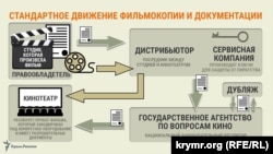Крым.Реалии уже проводили исследование вопроса теле- и кинопродукции в Крыму. Тогда директор симферопольского кинотеатра имени Шевченко Владимир Мирошниченко рассказал, что, поскольку после перерегистрации официальные документы показывают крымские кинотеатры, как предприятия России, дистрибьюторы не могут отказать в предоставлении фильмокопий кинотеатрам, ведь за этим может последовать жалоба в ФАС от последних. Тем не менее, источник Крым.Реалии из сферы кино в Крыму, не так оптимистичен: «Перерегистрация юридических лиц – это «мыльный пузырь», который может лопнуть в любой момент. Дело в том, что все фильмокопии имеют ключ (пароль), который синхронизирует фильмокопию с проектором. Существует реестр этих проекторов, и любой правообладатель по серийному номеру оборудования может определить на какой территории расположен данный проектор, компания какой страны его приобретала, где и у кого, и за каким кинотеатром закреплено оборудование. Перерегистрация – это попытка «закрыть глаза», но очень слабая. Ведь, идентификационные данные крымского проектного оборудования не передавали российским дистрибьюторам от перерегистрировавшихся кинотеатров вновь, после аннексии. Дистрибьюторы взяли данные из реестра, как данные об украинских проекторах в украинских кинотеатрах».