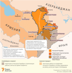 Соглашение также требует вывода армянских войск из трех районов: Агдамского; Кашатагского (который азербайджанцы называют Лачинским) и Карвачарского, который на азербайджанском языке известен как Кельбаджарский.
