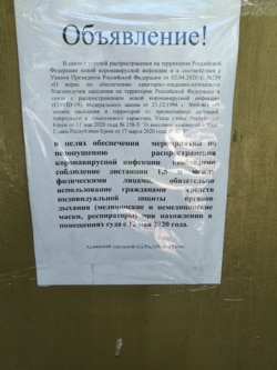 Работники Армянского городского суда, правда, к угрозе заражения COVID-19 относятся по-разному. Со слов адвоката Николая Полозова, представитель государственного обвинения на процесс пришла без средств индивидуальной защиты. Хотя на входных дверях в суд висит объявление о необходимости строго придерживаться требований, изложенных в указе российского главы Крыма по этому поводу.