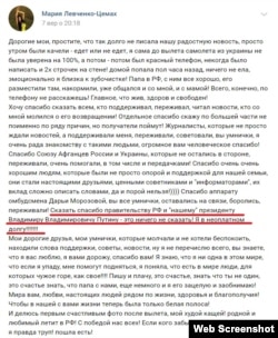 «Накормили, уже общался и со мной, и с мамой! Всего, конечно, по телефону не рассказать! Главное, что жив, здоров и свободен!» ‒ написала Мария Левченко-Цемах.
