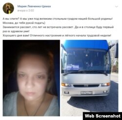 Дочь экс-боевика группировки «ДНР» Владимира Цемаха Мария Левченко-Цемах приехала в Москву. Об этом родственница фигуранта дела о сбивании рейса МН17 написала на своей странице в соцсети «ВКонтакте». Судя по фотографиям, опубликованным женщиной, в столицу России она приехала автобусом из Донецка.