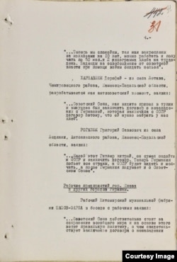 "...Теперь мы спокойны, так как закреплены за колхозами на 10 лет, можно работать и получать по 50 коп. и 2 килограмма хлеба на трудодень. Надежды на освобождение от советской власти при помощи войны ожидать нельзя".