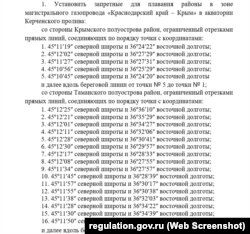 Запретные районы предполагается установить в акватории Керченского пролива в зоне магистрального газопровода «Краснодарский край – Крым». Проект соответствующего приказа Минтранса России опубликован на российском Федеральном портале нормативно-правовых актов и предусматривает введение ограничений как у берегов Крыма, так и возле Краснодарского края РФ.