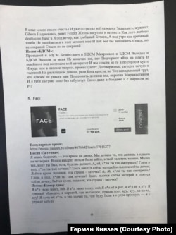 Радио Свобода публикует распечатки с текстами песен популярных молодежных исполнителей, которые раздали членам Экспертного совета при Управлении Федеральной антимонопольной службы России в Нижнем Новгороде – для того, чтобы обсудить необходимость превентивного запрета их концертов.