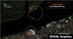 Эта организованная российской армией паромная переправа через Днепр хорошо известна: ВСУ не раз наносили удары по ее причалам. Один из таких ударов, как можно судить по снимку спутника Sentinel-2, произошел 23 сентября: на нем виден дым, идущий от причала парома в Новой Каховке.