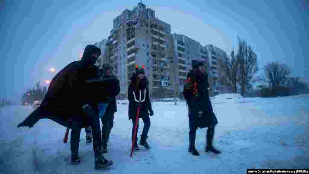 Коли вже майже стемніло, діти пішли колядувати на «стару» Авдіївку. Дорогою пройшли повз заміноване поле за яким передова, а далі – Донецький аеропорт