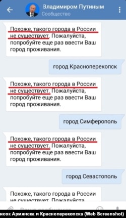 Крымчанка Нина Коробко, которая пыталась пожаловаться Владимиру Путину на кислотные выбросы «Крымского титана», столкнулась с тем, что мобильное приложение «Москва – Путину», принимающее вопросы для «прямой линии», не распознало Красноперекопск как город в России. Такая же ситуация – и с другими городами Крыма.