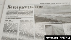«Крымские известия» в публикации «Не все улетели на юг» рассказывают подробности массовой гибели перелетных птиц на побережье залива Сиваш со стороны Ленинского района. По данным газеты, известный в Крыму орнитолог Игорь Сикорский склоняется к версии, что самого распространенного представителя здешней прибрежной орнитофауны – черношейную поганку – погубили фунгициды и бактерициды, используемые аграриями для предпосевной обработки семян зерновых. По мнению ученого, мертвые тушки этого вида встречаются при каждом мониторинге Арабатской стрелки. Жители села Каменского, расположенного недалеко от места массовой гибели пернатых, рассказывают, что часто озеро «выбрасывает» и мертвую мелкую рыбу. Море порой тоже выдает неприятные сюрпризы: помимо птиц и рыбы, бывает, на берег выносит мертвых дельфинов. Однако истинную причину гибели пернатых журналистам издания, побывавшем на месте происшествия, так и не удалось выяснить. Замначальника отдела внутреннего контроля и надзора в области ветеринарии Светлана Шамбазова, сославшись на отпуск, сказала, что не знает, каковы результаты проведенных анализов.