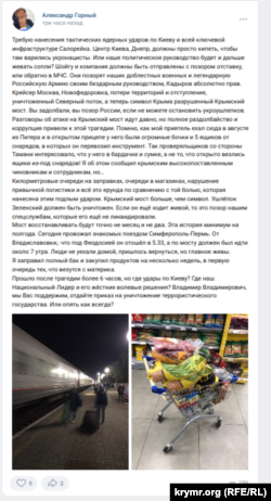 Переехавший в Крым после аннексии российский блогер Александр Горный настроен более воинственно, призывая нанести ядерные удары по Киеву и другим украинским городам. «Требую нанесения тактических ядерных ударов по Киеву и всей ключевой инфраструктуре Салорейха. Центр Киева, Днепр, должны просто кипеть, чтобы там варились укронацисты. Или наше политическое руководство будет и дальше жевать сопли? Шойгу и компания должны быть отправлены с позором отставку, или обратно в МЧС. Они позорят наших доблестных военных и легендарную Российскую Армию своим бездарным руководством, Кадыров абсолютно прав. Крейсер Москва, Новофедоровка, потери территорий и отступление, уничтоженный Северный поток, а теперь символ Крыма разрушенный Крымский мост», – пишет Горный на своей странице «Вконтакте».
