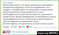 Сбежавший в Крым экс-депутат Верховной Рады Украины от партии регионов Олег Царев в последнее время уделяет много внимания работе в пабликах. «Можно преположить, что взрыв произошёл на автомобиле, который ехал синхронно, и в том же направлении, что и поездом с топливом. Для этого автомобиль со взрывчаткой должен был догнать поезд, поравняться с ним и самоподорваться. Как раз поэтому вышла из строя именно правая полоса. Взрыв направленный, из автомобиля в сторону железнодорожного моста, об этом можно сделать вывод по тому, как сдвинулись разрушенные плиты. Все таки надеюсь, что одна полоса на мосту осталась целой», пишет он в своем телеграм-канале.
