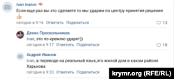 Пользователь под ником Ivan Ivanov грозится: «Если еще раз вы это сделаете, то мы ударим по центру принятия решения». «Ivan, в переводе на реальный язык – это жилой дом в каком районе Харькова», – напоминает Андрей Иванов своему однофамильцу, куда в действительности стреляет российская армия.