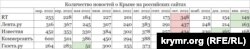 В среднем эти российские СМИ публикуют по 5-10 новостей о Крыме в день. По нашим подсчетам, наибольшее упоминание о Крымском полуострове в российских новостях было в октябре – после взрыва на Керченском мосту. Зимой этот показатель немного снизился, однако все равно Крым и другие оккупированные Россией украинские территории остаются главными темами российских медиа, вытесняя новости о событиях, происходящих в регионах соседней России.