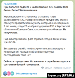 Около семи часов вечера во вторник, 22 ноября, жители Севастополя, Евпатории и Сак услышали ряд громких взрывов, очереди зенитных орудий, а также наблюдали пуски ракет российской противовоздушной обороной по воздушным целям. Позже российский губернатор Севастополя сообщил, что украинские дроны атаковали Балаклавскую ТЭС, но все они сбиты. Что пишут в крымском сегменте соцсетей по этому поводу?