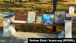 На лавочке местный художник выставил свои работы на продажу, но желающих их приобрести пока не наблюдается. Сезон закончен, туристы разъехались.