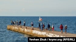 У ларька с сувенирами – туристы. Севастопольцам вещицы «на память» о родном городе совершенно ни к чему. Продавцы интереса к потенциальным покупателям не проявляют, сидят в глубине, уткнувшись в телефоны.