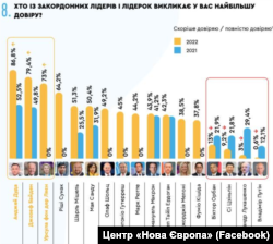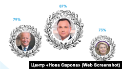 Интересно, что уже второй год подряд Дуда выходит на первое место – в 2021 году он пользовался доверием 52,5 процента украинцев, а с началом полномасштабного вторжения против Украины уровень доверия вырос радикально.