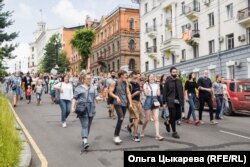 Выходили к протестующим и представители краевого правительства: пресс-секретарь губернатора Надежда Томченко и первый зампред регионального правительства Владимир Хлапов. Они хоть и призывали разойтись: мол, коронавирус же, но поблагодарили людей за поддержку губернатора. А после этого перед собравшимися выступили все желающие – в общей сложности таких набралось около 10 человек. Некоторые даже не представлялись. В основном ораторы задавались одними и теми же вопросами – почему убийства 16-летней давности расследовались так долго, почему только сейчас, когда Фургал стал губернатором, его арестовали? Впрочем, из-за постоянного скандирования лозунга "свободу!" и звука клаксонов проезжавших мимо машин, водители которых таким образом поддерживали собравшихся, слова выступавших можно было разобрать с трудом, не помогал даже мегафон.