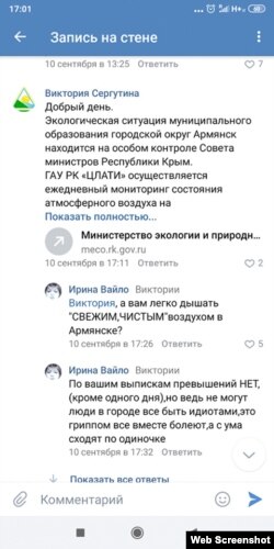 «В связи с этим правительство республики взяло под особый контроль экологическую ситуацию в Армянске, однако с тех пор никаких отклонений не было. В настоящий момент концентрация хлорида водорода и диоксида серы в атмосферном воздухе городского округа Армянск в норме», – заявил представитель Минэкологии Крыма в телефонной беседе с местной жительницей.
