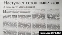 «Крымская газета» в статье «Наступает сезон шашлыков» пишет о том, что с 1 апреля в Крыму установлено начало летнего пожароопасного сезона. На полуострове вводятся ограничения в разведении костров. По данным подконтрольного России министра чрезвычайных ситуация Крыма Сергея Шахова, с начала года в Крыму зафиксировано около 300 пожаров, связанных с возгоранием сухой растительности и мусора. Только за минувшую неделю таких возгораний было 26, а всего на территории республики ликвидировали 96 пожаров. Из этих соображений в первый день апреля официально стартовал летний пожароопасный сезон. По статистике: в выходные и праздничные дни количество пожаров в лесу достигает 40% от их общего числа за неделю. При этом большинство их фиксируется в 10-километровой зоне вокруг населенных пунктов, то есть в наиболее посещаемых местах. В пожароопасный сезон категорически запрещается разводить костры, использовать мангалы, другие приспособления с открытым огнем, курить, бросать горящие спички и окурки в не предусмотренных для этого местах. Кроме того, нельзя использовать пиротехнические изделия, а также оставлять в лесу промасленный или пропитанный бензином, керосином и иными горючими веществами материал. Также запрещено выжигать траву под деревьями, на полянах, стерню на полях.