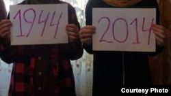 Крымские татары фотографируются с плакатами с напоминанием о трагедии 1944 года и продолжающихся репрессиях. Они делятся фотографиями в социальных сетях.