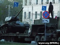 По данным корреспондента, после этой установки следовал танк военных лет Т-34 на синтетических гусеницах, самоходная артиллерийская установка и несколько десятков российских боевых машин, находящихся на вооружении береговых войск российского Черноморского флота.