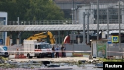 Поврежденное из-за удара беспилотника здание в Москве, 24 июля 2023 года
