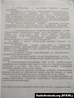 2 апреля по поручению министра обороны России начальник Генерального штаба Вооруженных сил России приказал главнокомандующему Воздушно-космическими силами РФ и командующим группировок войск подать в Генеральный штаб РФ списки российских военнослужащих, которым единовременно выплатят премии за захват или уничтожение вооружения, военной техники и живой силы Украины.