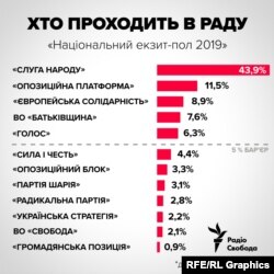 Президентская партия «Слуга народа» набирает 43,9% голосов на внеочередных парламентских выборах, свидетельствуют данные национального экзит-пола.