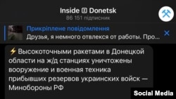 «Высокоточными ракетами в Донецкой области на железнодорожных станциях уничтожены вооружение и военная техника резервов прибывших украинских войск», – отмечалось в посте, который до сих пор можно найти в этом Telegram-канале.