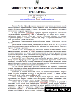 В самом Минкультуры вопрос Крым.Реалии о том, есть ли соответствующий указ о реформировании, и если нет, то когда его можно ожидать, проигнорировали.